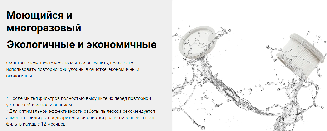 Фильтры подходят для повторного применения, что делает обслуживание пылесоса удобным и экономичным при регулярной уборке.